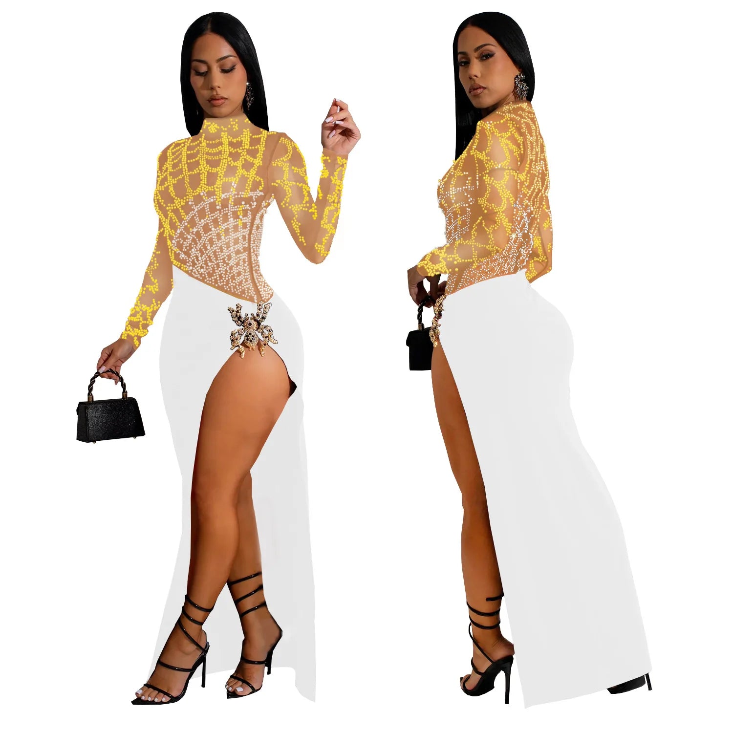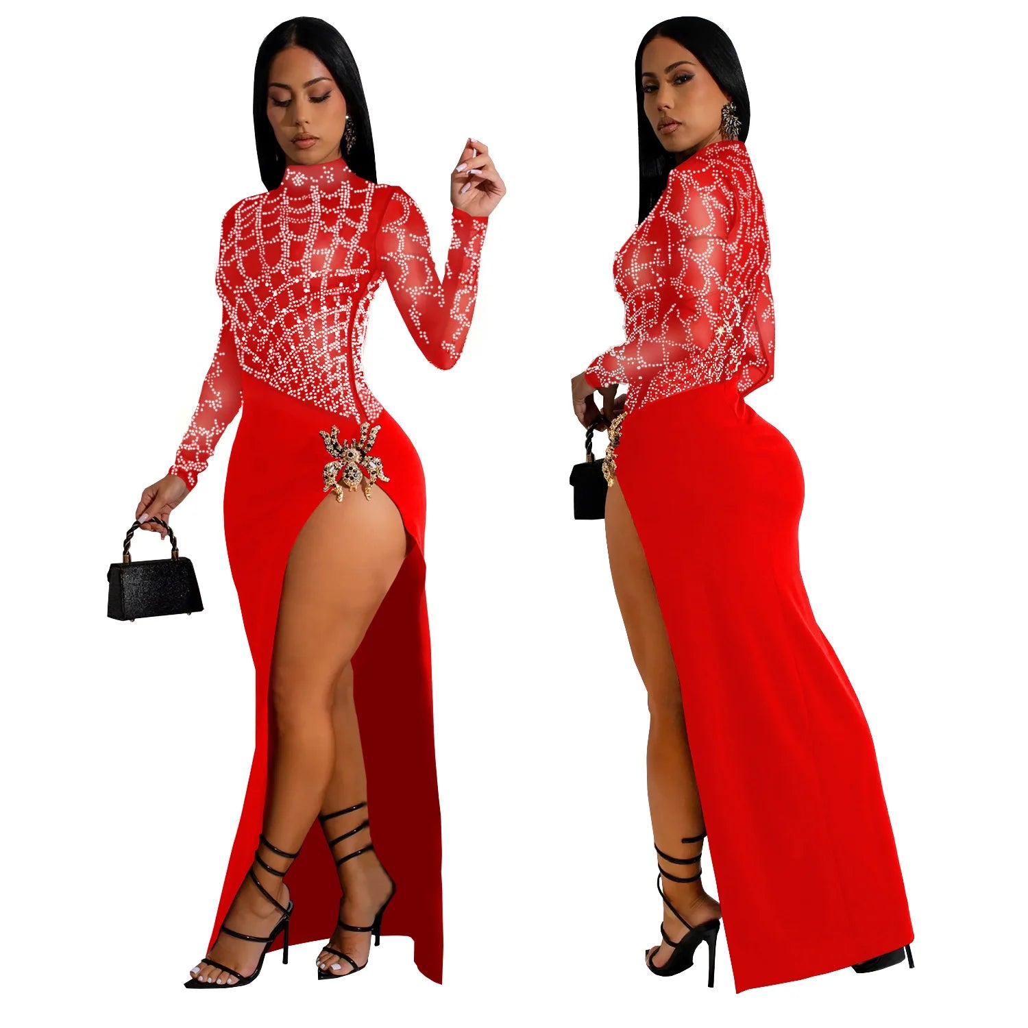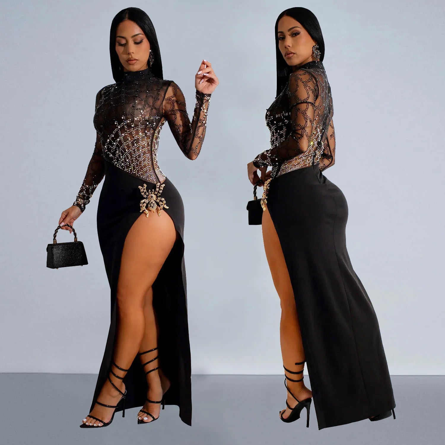 2024 Autumn Women's Hot Diamond Sexy Cutout Long-sleeved Slit Party Dress Birthday Dress for Women Sexy Dress