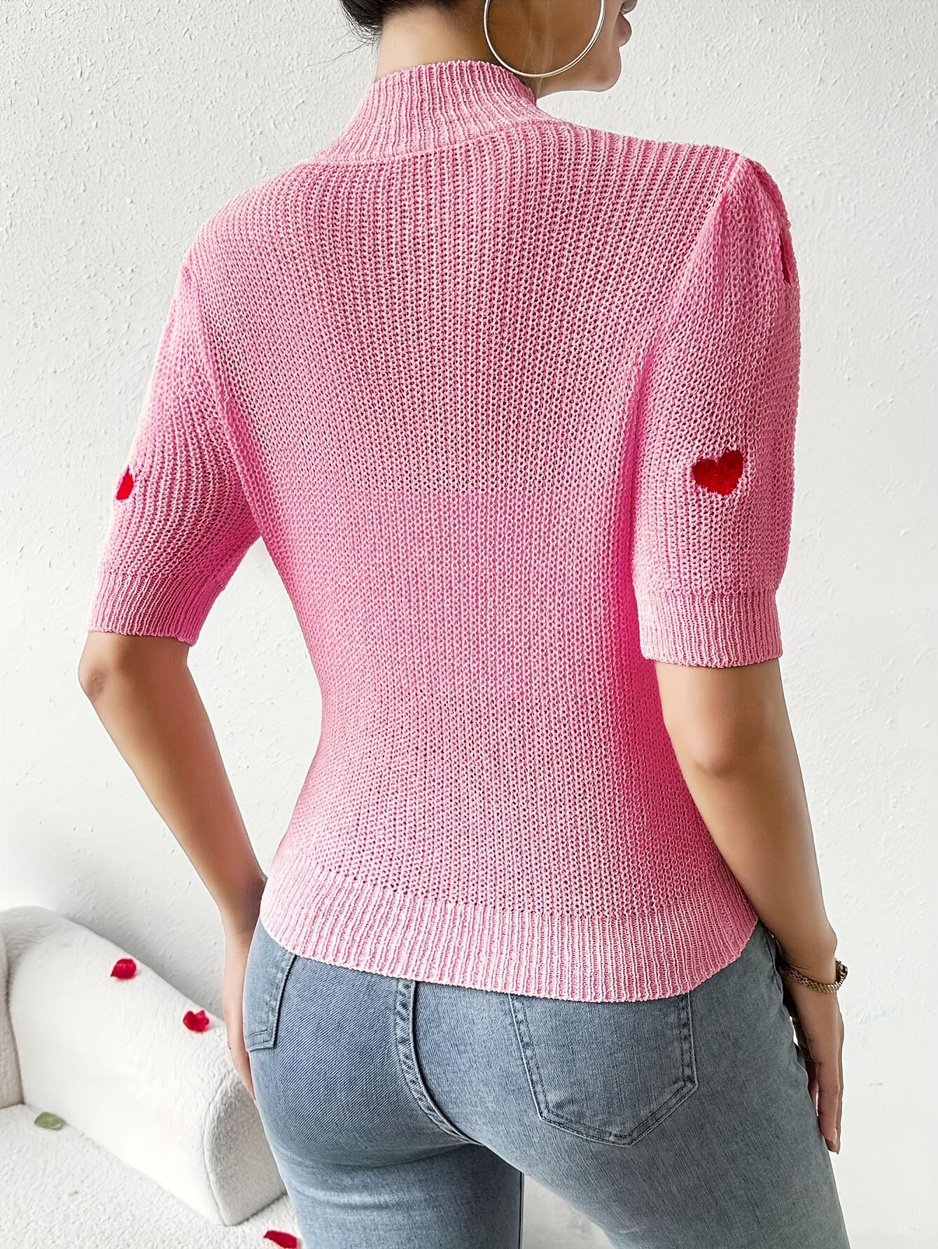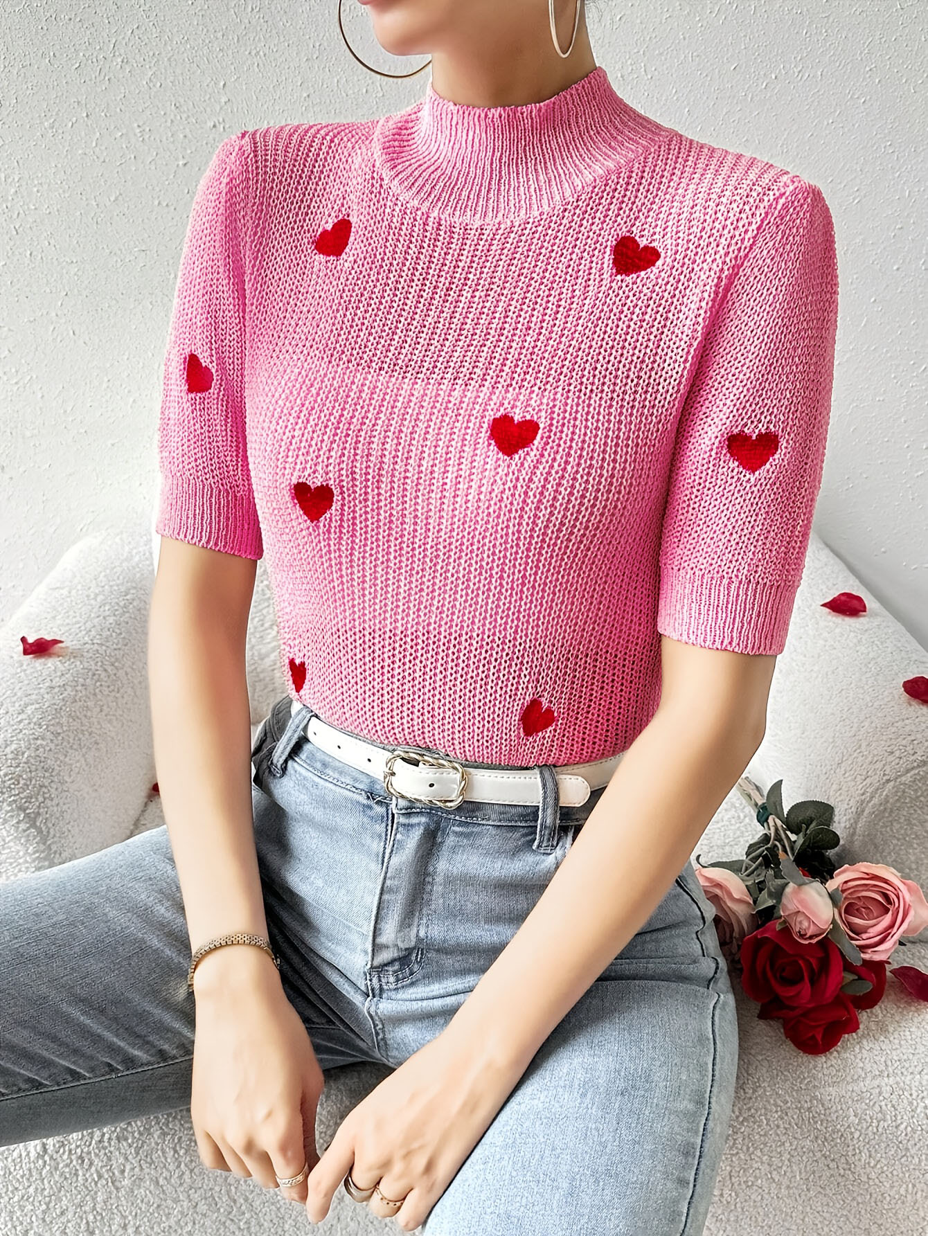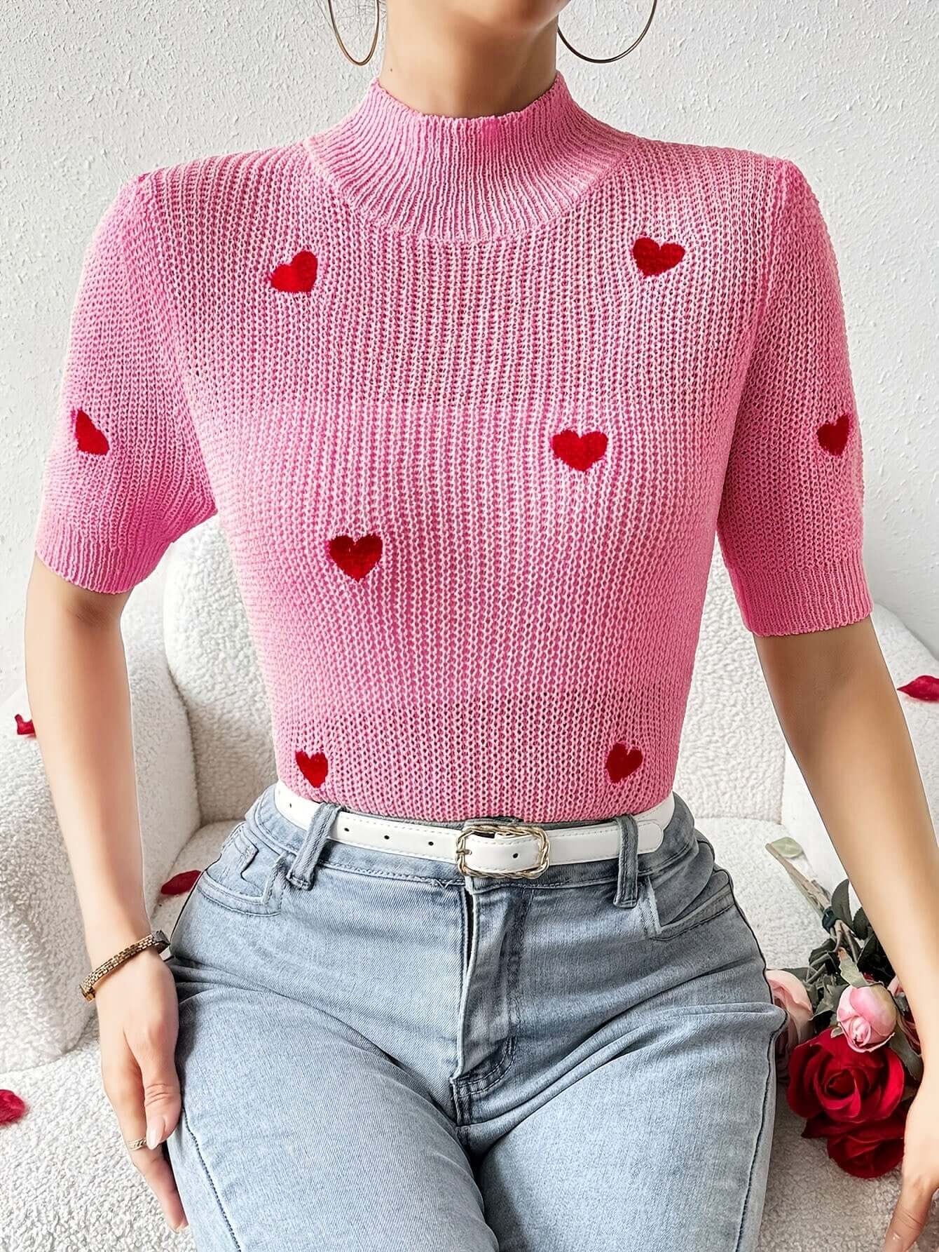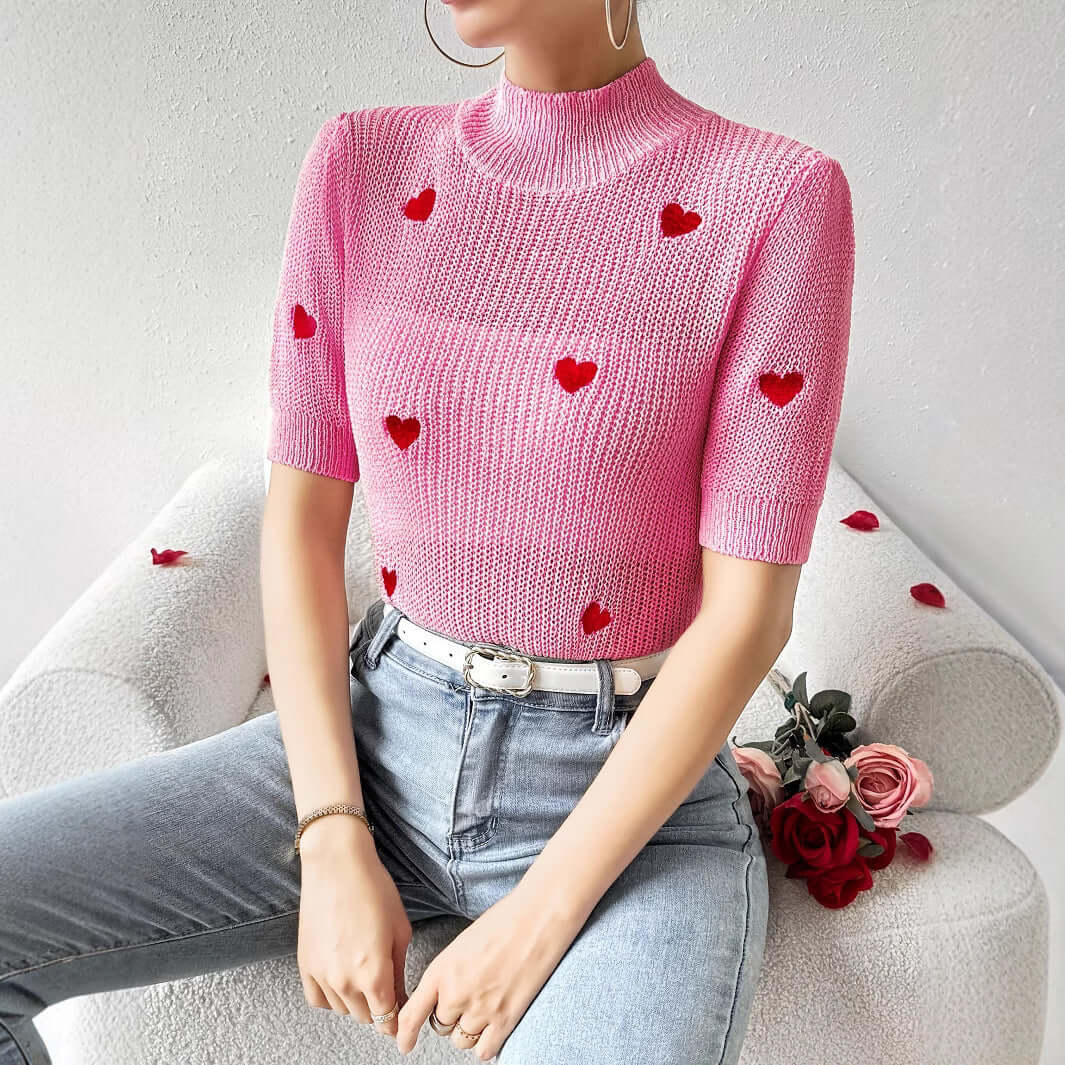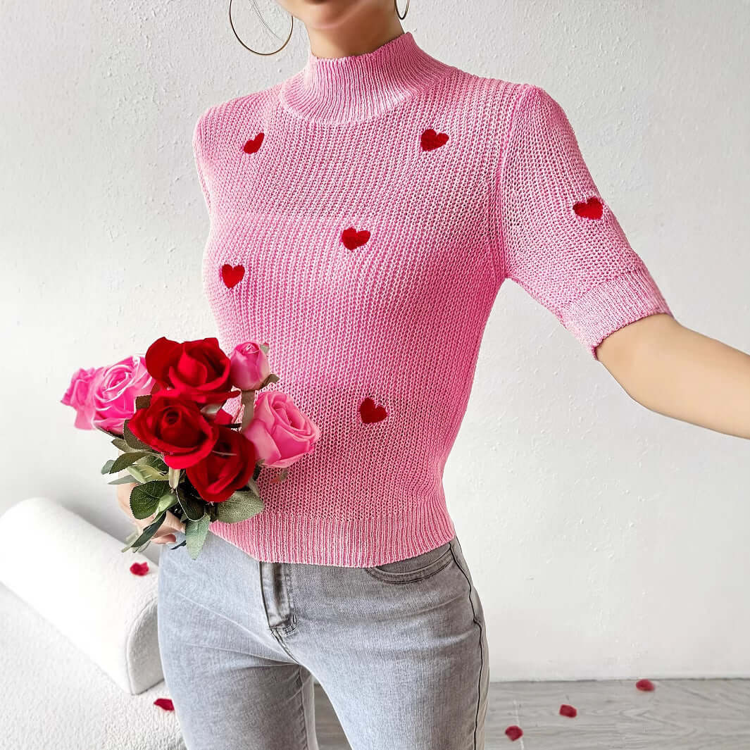Fashion High-neck Heart Knit Short Sleeve Women