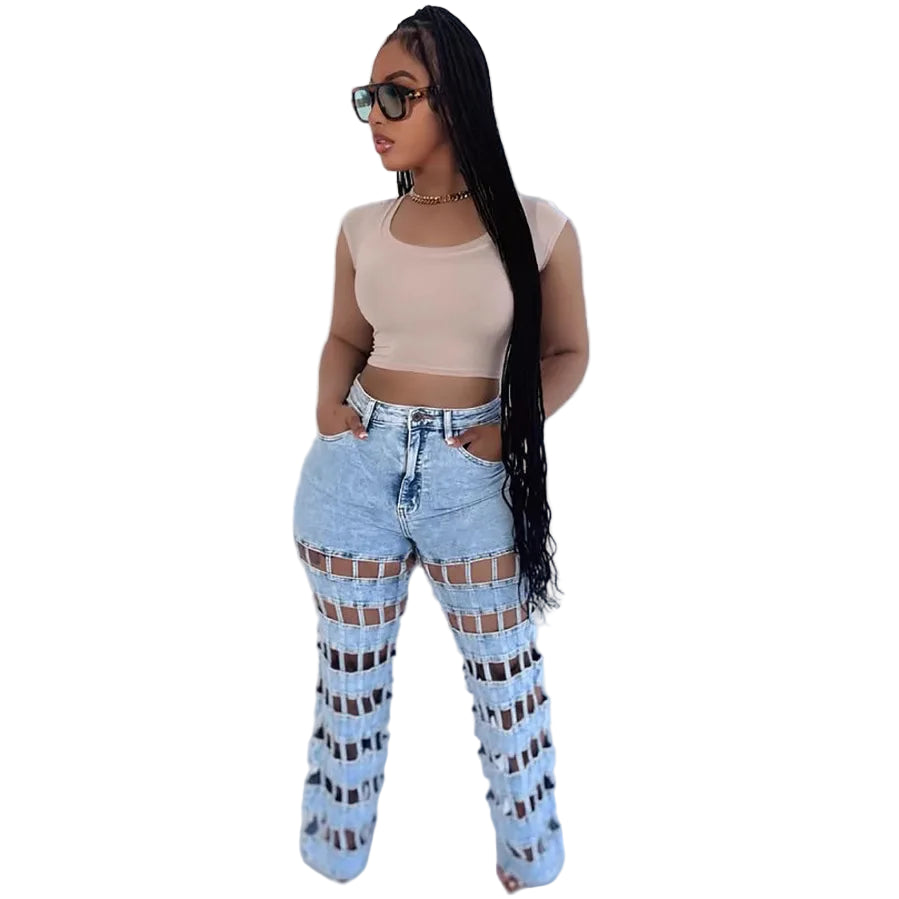 High Waist Hollow Out Denim Pants - Chic & Trendy Style
