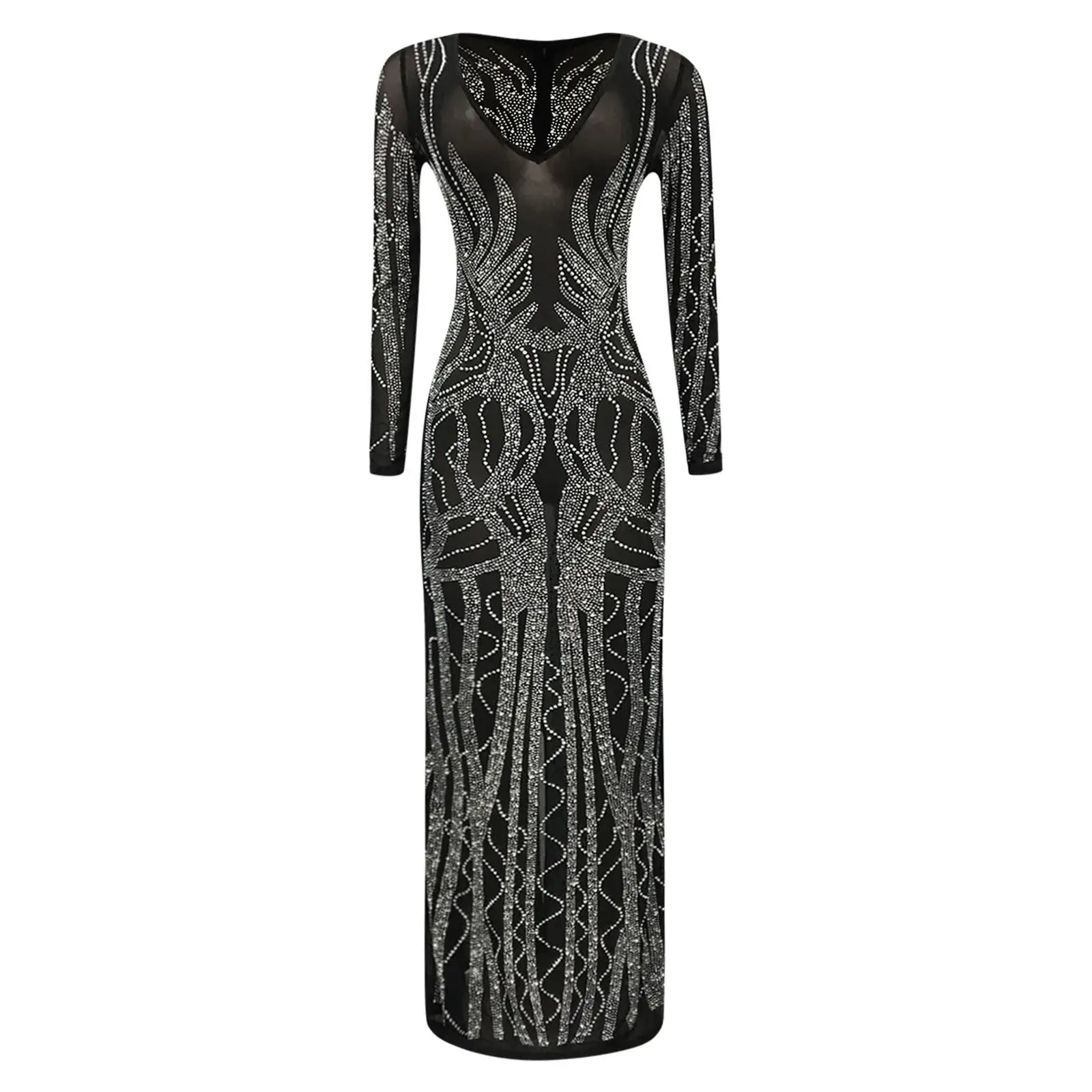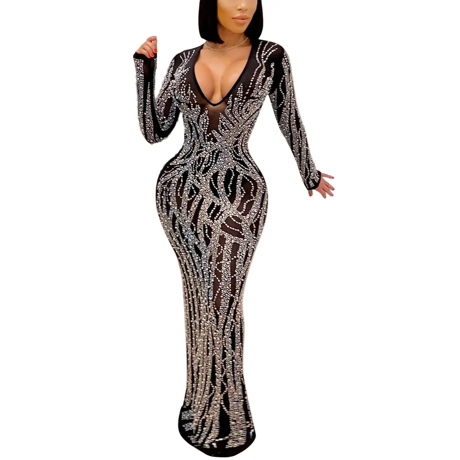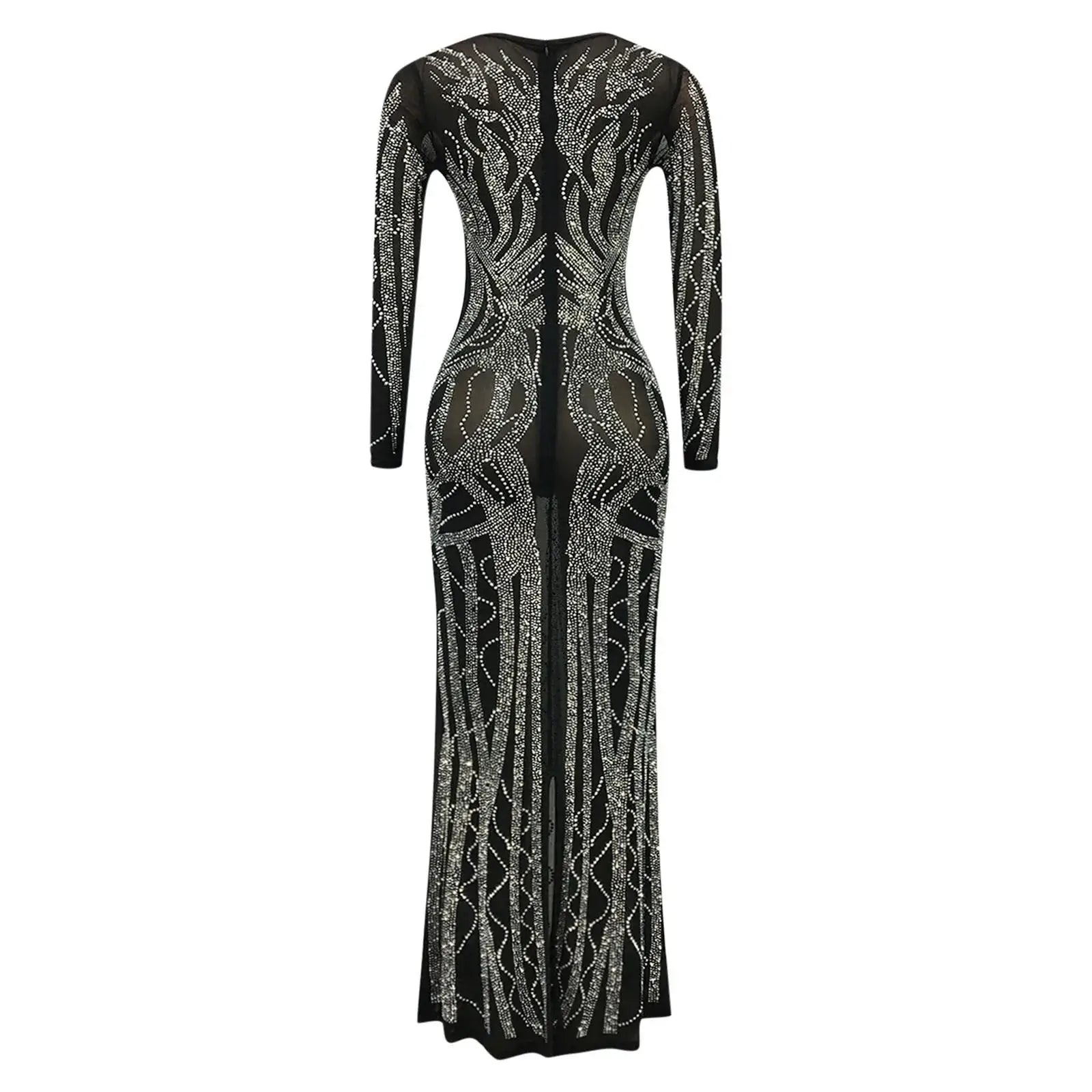 Sheer Rhinestone Mesh Maxi Dress – Sexy V-Neck, Long Sleeve, Slit Gown