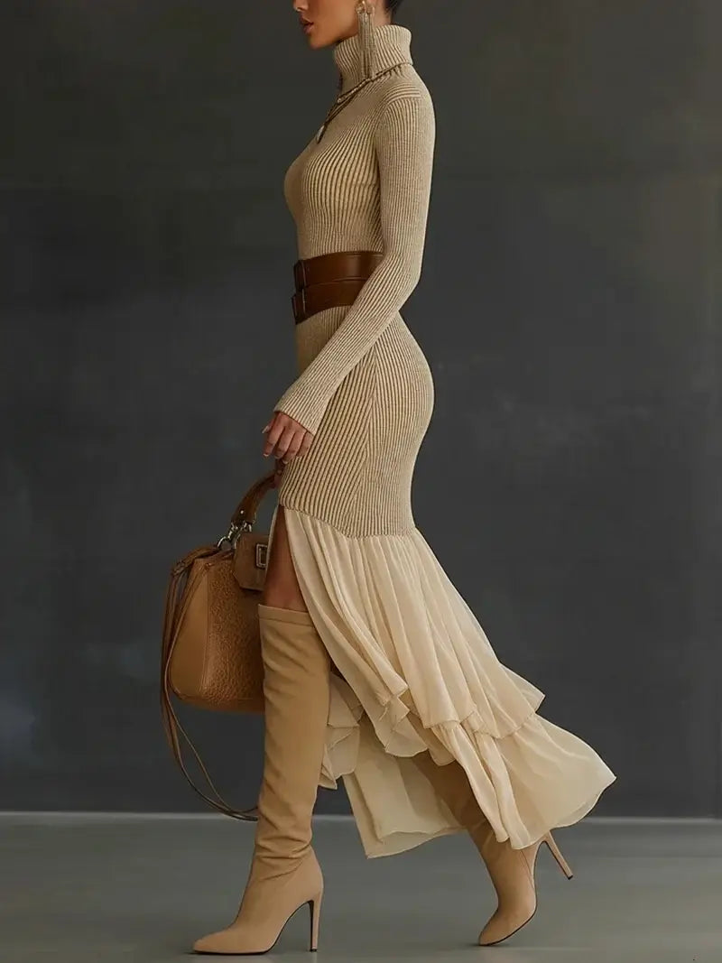 Turtleneck Bodycon Dress for Women Long Sleeve Knitted Maxi Dress Elegant Asymmetrical Ruffle Hem Evening Party Midi Dresses