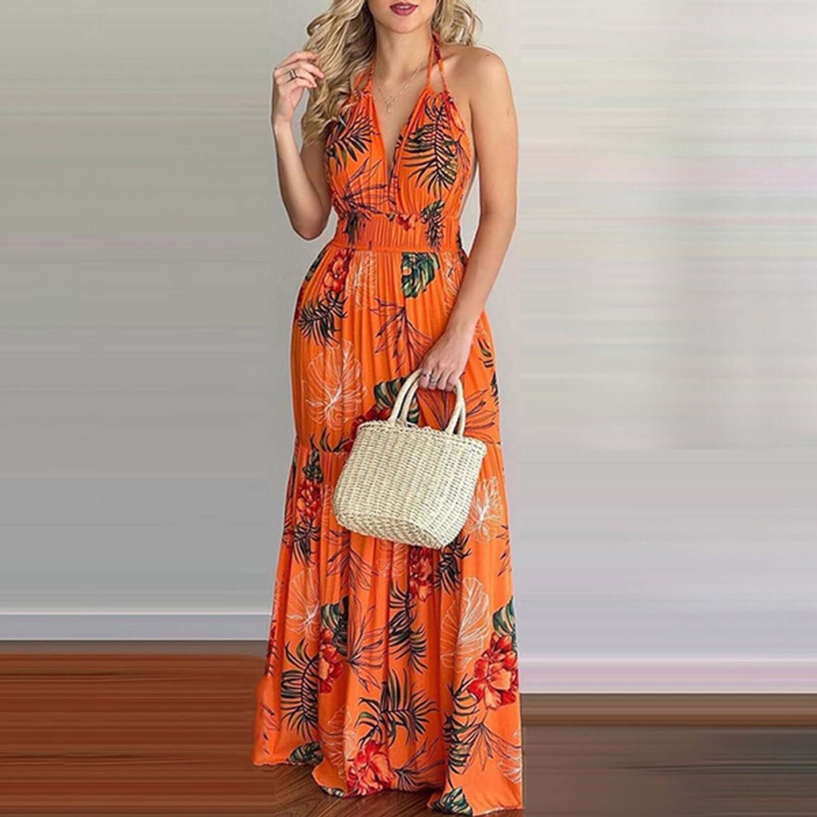 Women Tropical Print Halter Backless Maxi Dress Sexy Sleeveless Deeep V Beach Dress