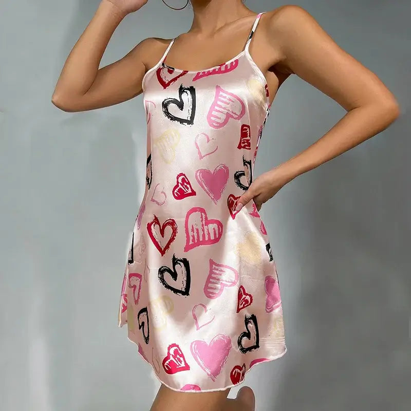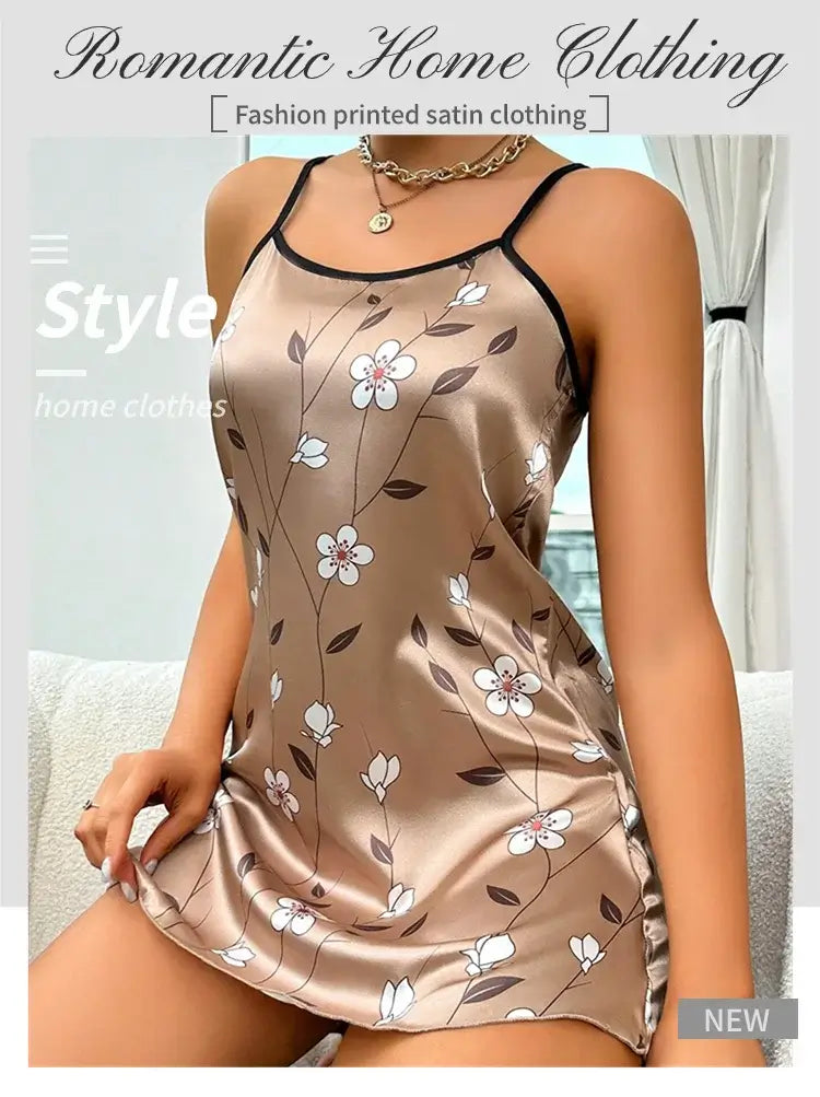 Women's Sleepdress Satin Floral Print Nightdress Comfortable Spaghetti Strap Sleepwear Dress Luxurious Satin Slip Nightdress
